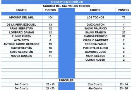 En el debut de los +30 en el Torneo de Verano de Campana, Máquina del Mal apabulló 104-73 a Los Tochos. Goleo parejo en el ganador, que tuvo a Gerardo Antoine Tarrie (19) como su máximo artillero. Por el lado del equipo surgido de la planta Tenaris el peso de la ofensiva recayó casi exclusivamente en Fabricio Bianchi (32) y Franco Salvo (23).