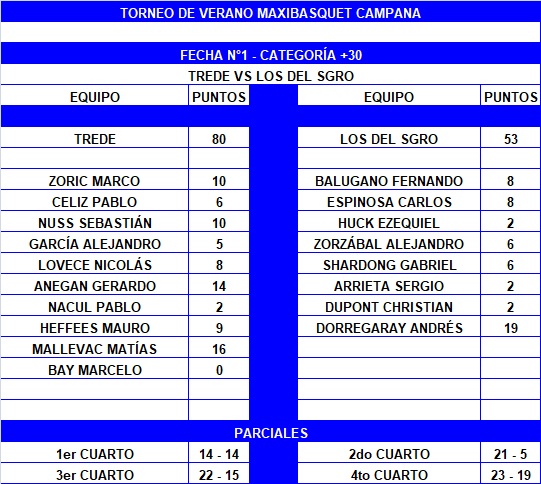 Trede derrotó 80-53 a Los del Sgro, en el cierre de la primera fecha de la categoría +30 del Torneo de Verano de Campana. Matías Mallevac (16) y Gerardo Anegón (14) llevaron a la victoria al conjunto de San Martín. Andrés Dorregaray (19) fue el destacado del perdedor.
