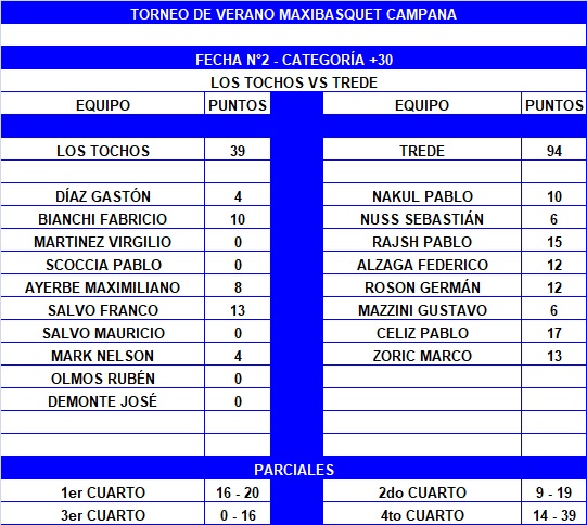 Con un parcial de 55-14 en la segunda mitad, donde justificó la victoria, Trede ganó su segundo juego del certamen en igual cantidad de presentaciones. Fue 94-39 ante los Tochos, por la fecha 2 de la categoría +30 en el Torneo de Verano de Campana. Seis jugadores puntuaron en doble dígito en el ganador, siendo Pablo "Il Capitano" Céliz (17) el máximo anotador. Franco Salvo (13) y Fabricio Bianchi (10) fueron las principales cartas de gol en el conjunto Tenario.
