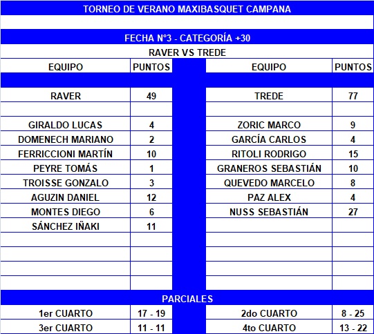 Raver debía salir a recortar terreno, e hizo lo que pudo, liderado por Aguzin. Enfrente, faltaba que anotara el Chelo, para un cuarto con poco para contar, que terminó 11 iguales y le bajó la persiana al partido. El último cuarto estuvo de más. Una ráfaga de Nuss primero, y otra de Rtoli a continuación, Trede estableció la diferencia máxima y dejó que el reloj se consumiera. El tridente Aguzín-Ferriccioni-Sánchez siguió facturando para Raver, pero estaba todo dicho.