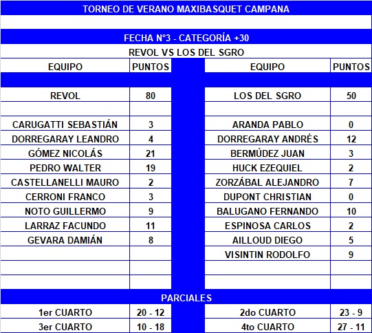 Al reanudarse las acciones se despertaron los del Sgro. Con un juego más intenso, de la mano del tridente conformado por Rodolfo Visintín (9), Alejandro Zorzábal (7) y Balugano, se llevaron el parcial 18-10 y achicaron la brecha a 14 (53-39) de cara al último cuarto. De arranque Sgro buscó ponerse a tiro, pero Revol aceleró otra vez, con Nico Gómez liderando la ofensiva, y pudo recuperar la ventaja que tenía la cierre del primer tiempo y cerrar el partido.