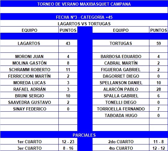 Por la tercera fecha del Torneo +45 de Verano en Campana, Tortugas se quedó con el clásico y el duelo de invictos ante Lagartos, a quien supero 59-43. Pablo Alarcón (28) lideró la ofensiva del ganador, mientras que Roberto "Tito" Schramm (11) y Sergio Bruni (10) fueron los destacados en el ataque del perdedor.