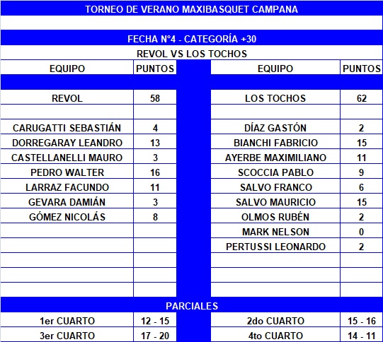 Revol llegó al partido con con muchas bajas importantes, como la de tu capitán, Guillermo Noto, bien cubierta por Sebastián Carugatti (4). Los Tochos pusieron toda la carne al asador, necesitados de cosechar la primera victoria. En el primer cuarto anduvieron parejos: Mauricio Salvo, de discretas actuaciones en los partidos previos, apareció en toda su dimensión y condujo a los Tenarios, haciendo jugar a sus compañeros y sumando 8 puntos en su casilla. Revol contestó a través de otro que hasta aquí no había despuntado: el Zurdo Dorregaray con sus corridas sumó de a dos. Los triples de Carugatti y Mauro Castellanelli (3) posibilitaron que su equipo se mantuviera expectante a 3 puntos (15-12) al llegar al primer break. En el segundo período Los Tochos metieron un parcial de 8-0 en el arranque, para abrir una luz de 11 (23-12), pero con mucho amor propio Revol limó la diferencia, con Pedro como principal argumento, para quedar otra vez a tiro (31-27) al irse al descanso largo.