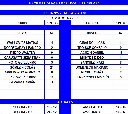 Victoria 66-57 de Revol ante Raver, por la fecha 5 del Torneo +30 de Verano en Campana. Nicolás Gómez (21) y Facundo Larraz (16) fueron los goleadores del conjunto azul. En los Cardos el mejor fue Daniel Aguzin (18).