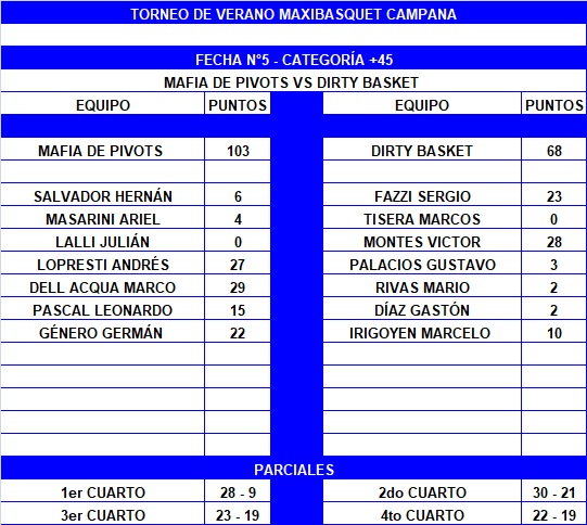 Lo liquidó de entrada, y después se divirtieron. Los extremos chocaban en la noche de Campana. Mafia quería asegurarse la punta sólo para ella y salió con todo, dispuesto a terminar temprano con el pleito, y de la mano de la dupla Lopresti-Género rápidamente tomó ventaja. Fueron 3 triples del base y 9 puntos del pivot, para un parcial de 28-9 que sentenció el resultado 30 minutos antes del final. Marcelo Irigoyen (10) y Fazzi salieron con la mira calibrada para la segunda manga, y elevaron la producción de los chicos duros. Pero las corridas de Del Acqua y los posteos de Género seguían redituándole a Mafia, que además sumó una racha de Leonardo Pascual (15) para terminar imponiéndose 30-21 e irse al descanso largo 58-30 arriba.