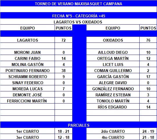 En el juego de clausura de la fase regular del Torneo +45 de Verano en Campana Oxidados se impuso 76 a 72 a Lagartos, en un ensayo de lo que será el choque entre ambos por un lugar en semifinales. Fernando Portinaro (38) la rompió, pero Oxidados se sustentó en el goleo de un quintero conformado por Gastón "el Loco" García (17), Edgardo Ríos (14), Martín Ortega (12), Diego Ailloud (10) y Fernando González (10) para vencer.