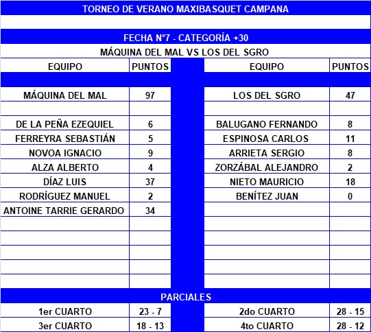 Sólido triunfo de Máquina del Mal 97-47 ante Los del Sgro, en la clausura de la fase regular del Torneo +30 de Verano en Campana. Díaz (37) y Gerardo Antoine Tarrie (34) fueron los artífices del gol del vencedor. Mauricio Nieto (18) fue el mejor del perdedor.