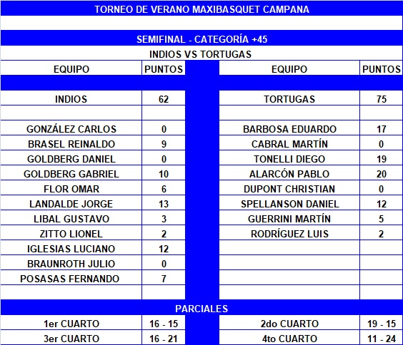 Tortugas es finalista del Torneo +45 de Verano en Campana, tras superar 75-62 a Los Indios de Moreno, en un partido en el que jugó como quería el Negriblanco en la primera etapa y como le convenía a los Anfibios en el complemento. Pablo Alrcón (20) fue el goleador del ganador, acompañado del regreso al nivel que supo acostumbrar de Diego "el Hormiga" Tonelli (19) y de Eduardo "el Oveja" Barbosa (17). Jorge Landalde (13) y Luciano Iglesias (12)  fueron los mejores del Negriblanco.