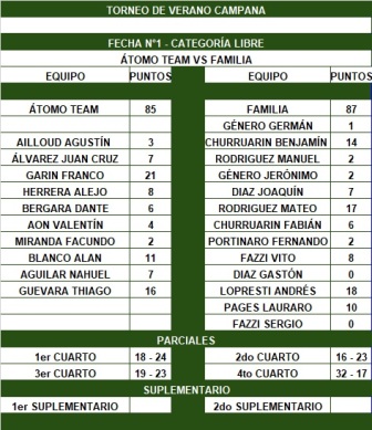 El partido terminó apretado, porque la Familia se puso a festejar y enfrente tenía a un equipo rápido, que en un abrir y cerrar de ojos limó la diferencia de 15 puntos que su rival había atesorado a lo largo de 30 minutos. Pero la sensación que quedó es que la suerte del juego siempre dependió del ganador, que mechando a los "viejos" con los "pibes", impuso condiciones, especialmente debajo del canasto, donde Átomo no tenía estatura para competir con la talla (a lo largo y a lo ancho) de los veteranos de Familia.