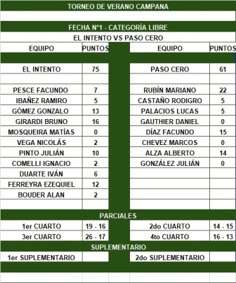 El Intento derrotó 75-61 a Paso Cero, en el primer juego de ambos en la categoría Libres del Torneo de Verano en Campana. Bruno Girardi (16), Gonzalo Gómez (13) y Ezequiel Ferreyra (12) encabezaron la ofensiva del Celeste. Mariano Rubín (22) fue el goleador del juego y el más peligroso en el elenco Azul, secundado por Facundo Díaz (15) y Alberto Alza (14).