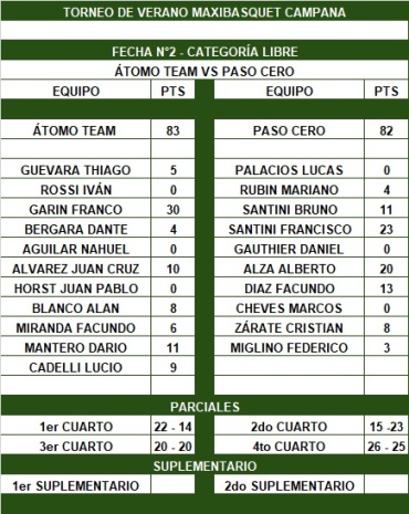 En lo que hasta el momento fue el mejor partido del verano, Átomo Team se impuso 83-82 ante Paso Cero, por la segunda fecha del Torneo de Libres de Campana. Franco Garín (30) fue la figura excluyente del ganador. Francisco Santini (23) y Alberto Alza (20) los destacados del Azul.