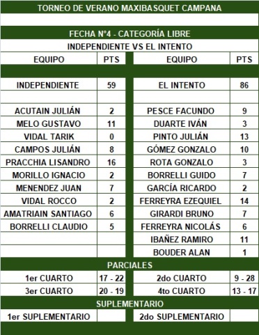 El Intento le metió otro reset a la tabla del torneo de libres, am propinarle la segunda derrota en fila a Independiente, al que superó 86-59, por la cuarta fecha del Torneo de Libres de Verano en Campana. Ezequiel Ferreyra (14) y Julián Pinto (13) fueron nuevamente destacados en el vencedor. Por su parte el Rojo tuvo a Lisandro Pracchia (16) como máximo exponente.