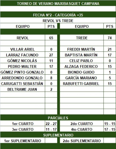 Trede superó 74-65 a Revol, en el recupero del juego postergado de la fecha 2 del Torneo de Maxibásquet +35 de Verano en Campana. Martín "el Chino" Freddi (21), Martín Baptista (17), y Federico Álzaga y Gabriel Rabuffetti (ambos con 15 unidades) conformaron el póker de ases del conjunto de San Martín. Facundo Larraz (27) fue el más consistente del perdedor, secundado por Walter Pedro (17).