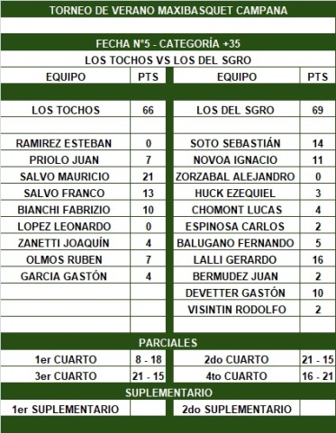 En la previa el partido tenía el interés de que el ganador se quedaba on el segundo puesto de la fase regular y clasificaba en forma directa a semifinales Rápidamente Los del Sgro sacaba una distancia de 10 puntos (18 a 8) con un buen despliegue de conjunto. El segundo cuarto Los Tochos mejoraron y por intermedio de los aciertos desde el perímetro de los hermanos Salvo, la brecha se redujo a la mínima (30-29). Pero una bomba sobre la chicharra Soto estiró la ventaja de Sgro a 4 (33-29).