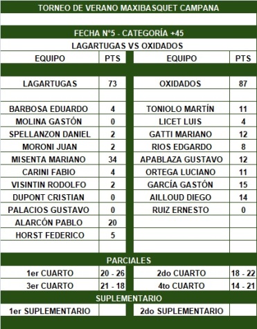 Haciendo un gran partido Oxidados derrotó 87-73 a Lagartugas, lo dejó sin invicto y complicó su pase directo a las semifinales del Torneo de Maxibásquet +45 de Verano en Campana. Fue por la quinta fecha del certamen. Gastón "el Loco" García (15) fue el punto más alto de un equipo que tuvo a 6 jugadores puntuando en doble dígito. Mariano Misenta (34) y Pablo Alrcón (20) fueron los goleadores del perdedor.