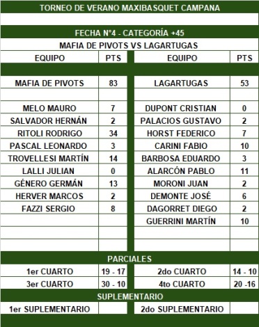 Con una gran actuación de Rodrigo Ritoli (34 - 8 triples) Mafia de Pivots ganó 83-53 un duelo, con mucho olor a clásico de la ABZC, a Lagartugas, en el juego postergado de la fecha 4 del Torneo de Maxibásquet +45 de Verano en Campana. Pablo Alarcón (11), Fabio Carini (10) y Martín Guerrini (10) fueron los más destacados del perdedor, que necesitaba el triunfo para sortear el repechaje.