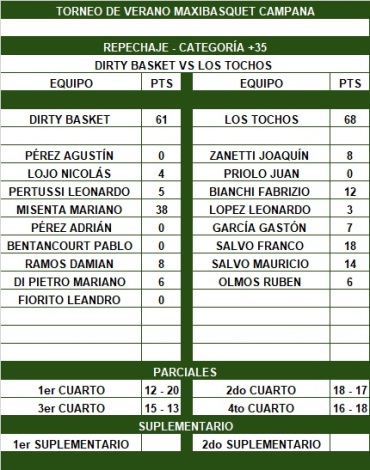 Los Tochos se impusieron 68-61 a Dirty Basket, en el repechaje para acceder a semifinales del Torneo de Maxibásquet +35 de Verano en Campana. Mariano Misenta (38) fue la figura del partido pero no le alcanzó al conjunto blanco. En el vencedor funcionó el tridente compuesto por los hermanos Franco (18) y Mauricio (14) Salvo y Fabrizio Biancho (12).
