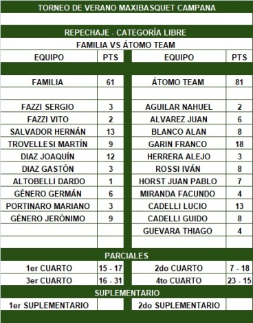 En el arranque del complemento Átomo siguió con la misma fórmula, con Garín inspirado. Salvador se hizo cargo del ataque de su equipo, pero nada detuvo el aluvión blanco, que derivó en un contundente 31-16 que estableció una máxima muy holgada (66-38). Con semejante diferencia, Átomo bajó la intensidad y, con una dinámica de juego más lenta, apareció lo mejor de Familia. Pero el partido ya tenía dueño. Átomo materializó la venganza y estará en semis ante El Intento, en un duelo a todo o nada.