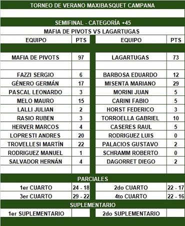 Viejas definiciones de las competencias de la ABZC y memorables partidos en los veranos de Campana vinieron a la memoria de los que presenciaron un partido que ya se instituyó como un clásico, más allá del nombre de los equipos. Lagartugas se plantó en zona y jugó al contragolpe con Misenta, que arrancó muy afilado. Del otro lado, Lopresti no lograba conectar con la red y se mostraba errático. Fue el turno de ponerse al equipo al hombro de Genero, que aprovechó la ausencia de Pablo Alarcón en el poste bajo para guiar a Mafia y llevarse el primer chico 24 a 18. En la segunda manga empezó a aparecer Lopresti, y junto con Trovellesi empezaron a lastimar desde tercera dimensión para estirar la diferencia a 11 (46-35) al llegar el descanso largo.