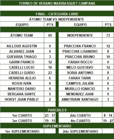 Independiente se consagró campeón de la categoría libres del Torneo de Verano en Campana. El Rojo se impuso 73-69 a Átomo Team. Bruno Pracchia (10) fue el MVP de la final y secundó a Franco Pracchia (12) y Gustavo Melo (12) entre los goleadores del ganador. El tridente integrado por Guido Cadelli (23), Lucio Cadelli (18) y Franco Garín (12) monopolizó el goleo del sub-campeón.